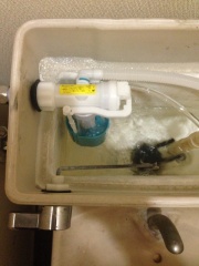 ラーメン店様の従業員専用トイレでのタンクの一部を修理しました。症状としましてはトイレの水を流すとタンクに補給する水が止まらなくなるとの事でした、実はよくある依頼の一つです。到着してトイレの場所に案内して貰うとタンク横に設置されている止水栓で一時水を止めていました。症状を確認する為に止水栓をもう一度回し、水がどのように止まらないかを再確認しました。確認し終えたらもう一度止水栓を回し水を止め、次にタンク内部を確認します。左画像が修理前のタンク内です。白いボール状の浮きが上手く稼動しない為に水が止まらない、勿論原因はそれだけとは限りません。金属部分が長年、水に触れているので劣化するのは当然です。そして右画像が劣化部品の取替え後です。今の最新部品には白いボール状の浮きはありません、その浮きの役割を補う箇所が緑色の部分になっています。金属部分もないので水に触れても安心です。これでトイレを1回1回使用する度に止水栓で水を止めなくて済むようになりました。気を付けなくてはならないのが止水栓を度々使うと止水栓からの水漏れも起こると言う事です。あくまでも止水栓はタンクの水が止まらなくなった時の応急処置でしかないので早めの修理をお勧めします